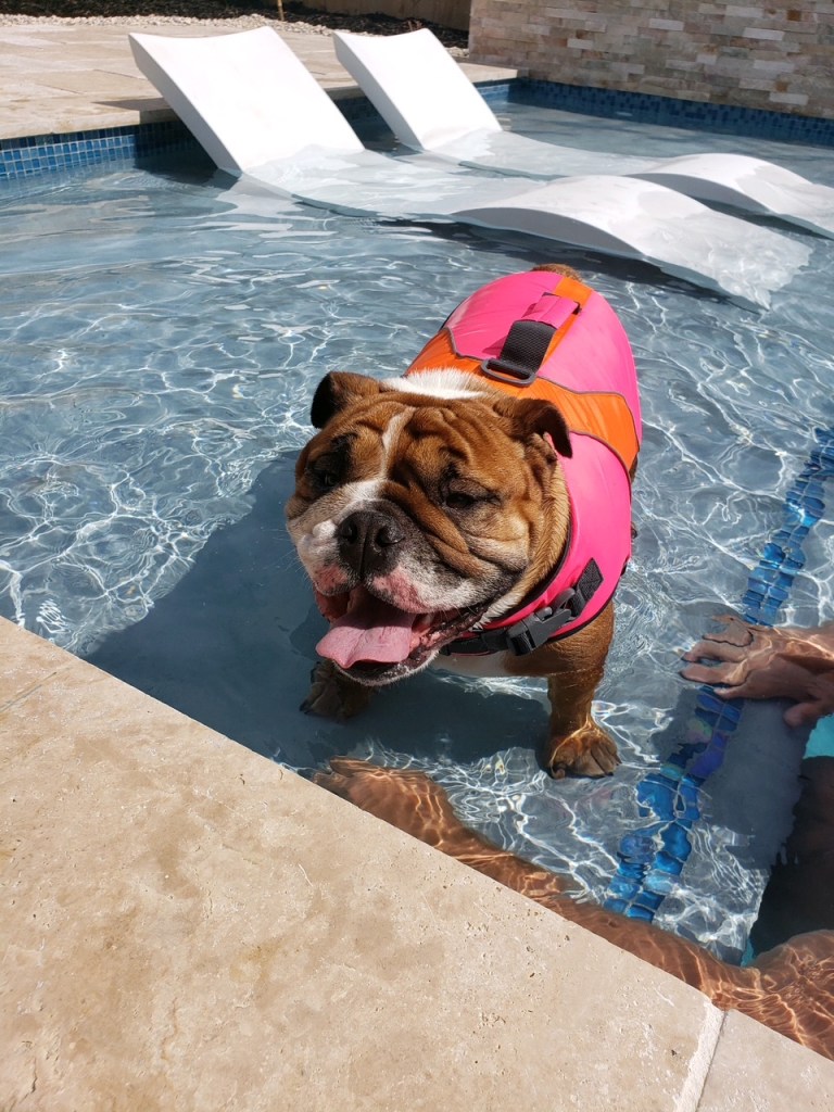 Ryan and Rachael proudly reside in Ascension Parish with their English bulldog Charlee. She isn’t much of a swimmer, hence the bright pink safety-vest that she wears, even while splashing around on the tan ledge. They love spending time in their own backyard whenever the sun is shining and weekend projects have been wrapped up.
